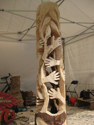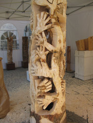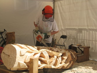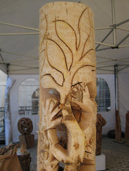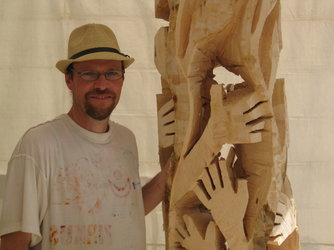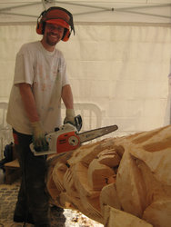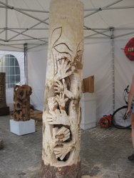 Auf dem Neumarkt in Winterthur ist Peter Imfeld in der Waldausstellung «Waldzeit – Mensch Wald Wissenschaft» zu Gast bei der Naturwissenschaftlichen Gesellschaft Winterthur und zeigt wie aus einem Baumstamm das Kunstwerk "nachhaltig" wird.
